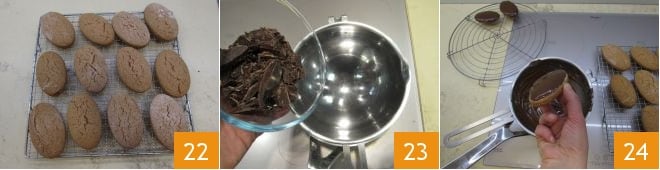 e deixar esfriar sobre uma grade 22. Continue assando os outros biscoitos amassando as sobras de massa e estendendo-as novamente. Deixe suas susumelle esfriar completamente e, enquanto isso, derreta o chocolate em banho-maria 23. Quando o chocolate estiver morno, mergulhe apenas a parte superior dos biscoitos 24