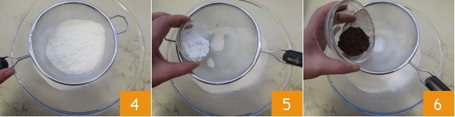 À parte, em outra tigela, peneire a farinha 4, o fermento 5 e o cacau 6.