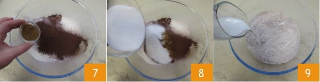 Em seguida, adicione a canela em pó 7, o açúcar refinado 8 e o leite em temperatura ambiente 9.