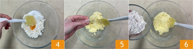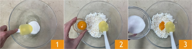 Para preparar os syrniki, coloque o queijo em uma tigela e amasse com uma espátula 1, depois adicione a gema 2 e o açúcar 3.