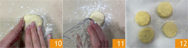 Coloque a bolinha sobre a superfície de trabalho, enfarinhe levemente a superfície e achate delicadamente 10, depois use um copo para obter uma forma redonda 11. Coloque os syrniki em uma bandeja polvilhada com farinha 12 e leve ao freezer por uma hora.