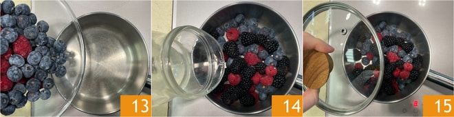 Enquanto isso, prepare o molho de frutas vermelhas: coloque em uma panela os mirtilos, framboesas e amoras 13, depois adicione um pouco de água 14 e cubra com a tampa 15.