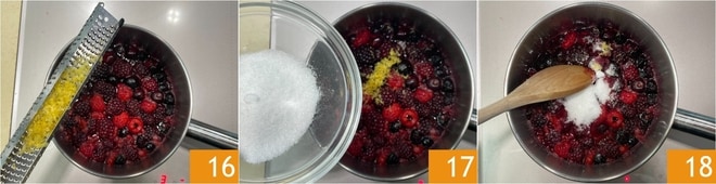 Ligue o fogo médio-baixo, depois adicione as raspas de limão raladas 16 e o açúcar 17. Cozinhe por cerca de 15 minutos, mexendo de vez em quando 18.