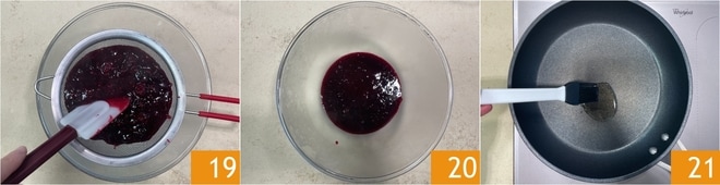 Após este tempo, coe o molho de frutas vermelhas 19 e deixe esfriar 20. Você pode passar à cocção: unte uma frigideira antiaderente com óleo vegetal 21 e aqueça bem.