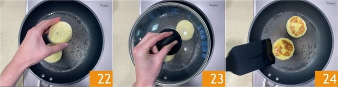 Coloque os syrniki 22, cubra com a tampa 23 e cozinhe por cerca de 3 minutos, virando-os de ambos os lados 24.