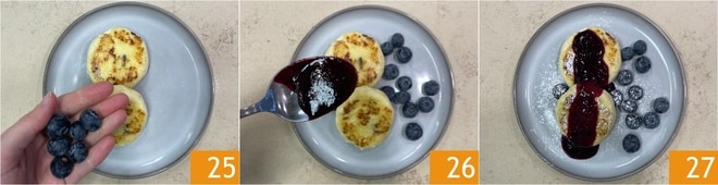 Sirva os syrniki acompanhados de mirtilos frescos 25 e do molho de frutas vermelhas 26, polvilhando com açúcar de confeiteiro a gosto 27!