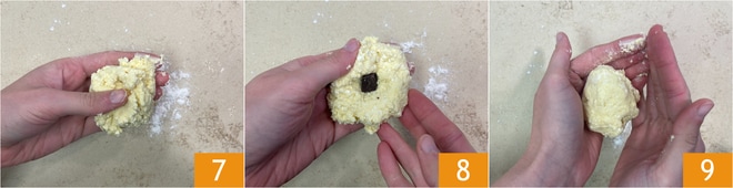 Polvilhe a superfície de trabalho com um pouco de farinha, depois retire um quarto da mistura e achate levemente na palma de uma mão 7. Insira no centro um cubo de chocolate amargo 8 e modele a mistura para formar uma bolinha 9.