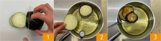 Para preparar os tacos de berinjela comece cortando a berinjela em fatias com cerca de 1 cm de espessura 1. Aqueça o óleo de sementes até a temperatura de 170°-175°, mergulhe 2-3 fatias de berinjela de cada vez 2 e frite até dourar 3. Escorra em papel toalha e reserve.