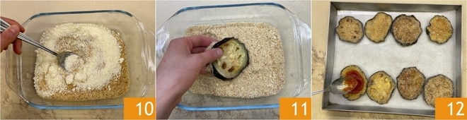 Misture para incorporar bem 10, em seguida, passe as berinjelas fritas na mistura, cobrindo ambos os lados 11. Coloque as berinjelas em uma assadeira forrada com papel manteiga e distribua uma colher de chá de molho de tomate 12.