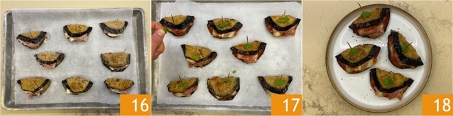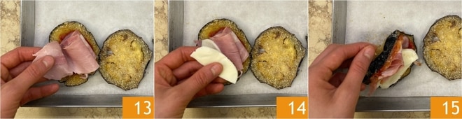 Adicione uma fatia de presunto 13 e uma de mussarela 14. Dobre a berinjela ao meio e prenda com um palito de dente 15.