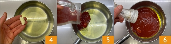 Agora prepare o molho: em uma panela, aqueça um fio de azeite com um dente de alho 4, depois adicione o purê de tomate 5 e sal a gosto 6.