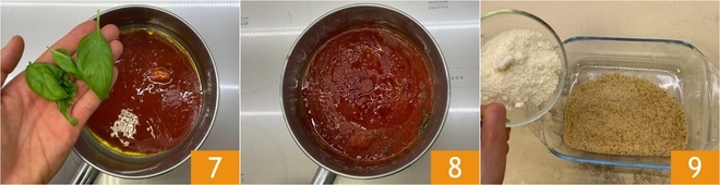 Perfume com algumas folhas de manjericão 7, misture e cozinhe em fogo médio-baixo por 5-10 minutos 8. Enquanto isso, corte a mussarela em fatias, depois prepare a farofa misturando a farinha de rosca e o parmesão em uma assadeira 9.