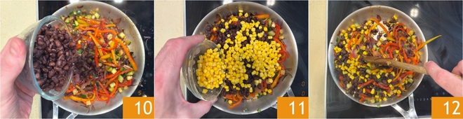 Depois desse tempo, adicione também os feijões pretos pré-cozidos, bem escorridos 10 e o milho também bem escorrido 11. Misture e continue a cozinhar em fogo médio 12.