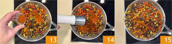 Tempere com a páprica doce 13, uma pitada de sal e uma pitada de pimenta-do-reino 14. Deixe cozinhar em fogo baixo nos últimos 4 minutos 15.