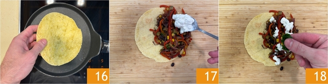 Aqueça as tortillas de milho em uma panela antiaderente, de ambos os lados 16. Distribua o recheio ainda quente sobre uma parte da tortilla, adicione a ricota 17 e perfume com salsinha picada 18.