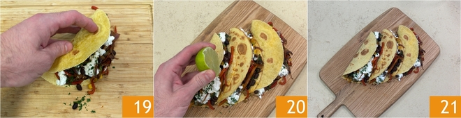 Feche cada taco ao meio 19 e transfira-os, um a um, para uma tábua. Esprema um pouco de suco de limão para um toque de acidez 20 e seus tacos vegetarianos estão prontos para serem servidos 21!