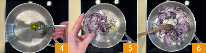 Em uma frigideira, coloque o azeite de oliva extra virgem 4 e adicione primeiro as cebolas roxas 5. Deixe cozinhar em fogo médio por 2 minutos 6.