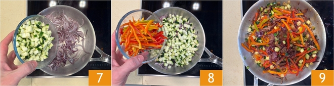 Neste ponto, adicione as abobrinhas 7 e os pimentões 8. Cozinhe em fogo médio por 8 minutos 9.