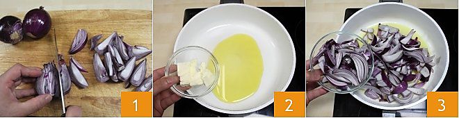 Para preparar a tagliata com cebolas agridoce, comece descascando as cebolas roxas. Corte-as em 4 partes e depois em gomos menores 1, em seguida, pegue uma frigideira antiaderente e aqueça o azeite de oliva extravirgem, quando estiver bem quente adicione a manteiga 2. Quando a manteiga derreter adicione os gomos de cebola roxa 3 e deixe refogar delicadamente.
