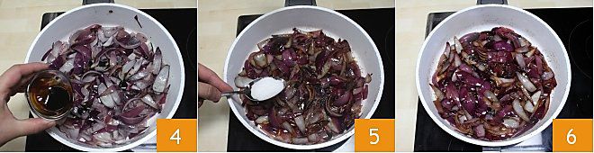 Quando as cebolas roxas começarem a amolecer, adicione o vinagre balsâmico 4 e o açúcar 5. Salgue a gosto e deixe cozinhar até que atinjam uma consistência macia, mas não desfeita 6.