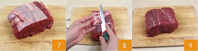 Agora cuide da carne: retire a carne da geladeira pelo menos uma hora antes de cozinhar, para que não esteja muito fria, mas em temperatura ambiente. Coloque o contra-filé ou entrecôte em uma tábua de cortar 7 e com uma faca afiada remova a camada de gordura da superfície 8 até desengordurá-la completamente 9.