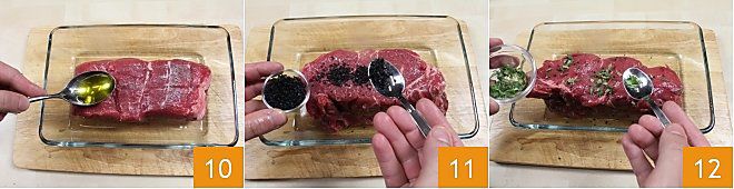 Em seguida, transfira a carne para uma assadeira e despeje o azeite por cima 10, usando as mãos para untar bem o pedaço. Polvilhe a carne com o sal negro do Havaí 11 e com as folhinhas de tomilho 12.