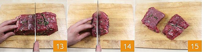 Transfira novamente a carne temperada para a tábua de cortar e divida-a em duas 13, em seguida, corte ao meio cada pedaço obtido 14 até obter 4 bifes 15.
