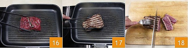 Aqueça muito bem uma grelha ou uma frigideira antiaderente e sele os bifes de ambos os lados (16-17) atingindo o ponto de cozimento desejado. Se preferir que a parte interna permaneça rosada e não seca, cozinhe por no máximo 4-5 minutos. Evite furar a carne durante o cozimento para evitar que seus líquidos escapem. Uma vez cozido, transfira o bife para uma tábua e corte-o em oblíquo para obter fatias mais precisas e compactas 18.