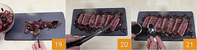 Forme uma camada de cebolas caramelizadas em um prato de servir 19 e coloque a tagliata por cima 20. Guarneça com mais sal negro do Havaí e folhinhas de tomilho 21 e sirva imediatamente sua tagliata com cebolas agridoce!