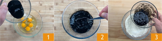 Para preparar as tagliatelle ao negro de sépia com pecorino, mexilhões e bacon, comece pela massa fresca: quebre os ovos em uma tigela e adicione o negro de sépia 1, depois bata com um garfo para misturar 2. Despeje essa mistura em uma tigela onde você já misturou a farinha de trigo tipo 00 e a sêmola de trigo duro 3.