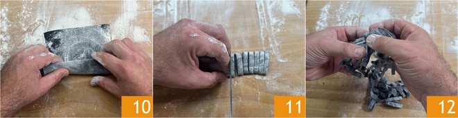 Enrole as folhas pelo lado curto 10 e corte os rolinhos em tiras com cerca de 7 mm de largura 11. Desenrole as tagliatelle ao negro de sépia 12.