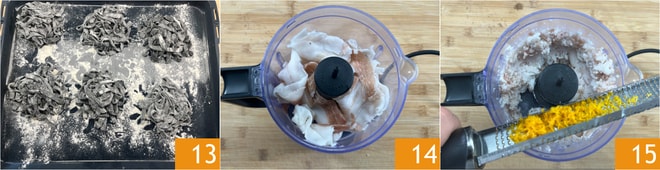 Coloque-as em uma assadeira polvilhada com sêmola 13 e leve à geladeira até o momento de usar. Passe para a pasta de bacon: coloque as fatias de bacon em um processador 14 e bata na velocidade máxima por 30 segundos. Em seguida, adicione a casca de laranja ralada 15.