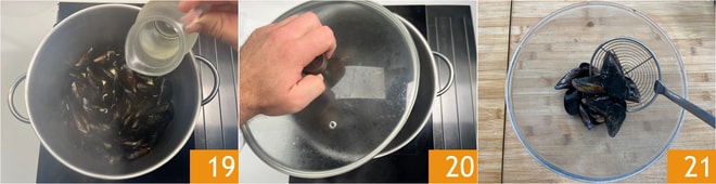 Refogue com vinho branco 19 e deixe evaporar toda a parte alcoólica. Cubra a panela com uma tampa 20 e cozinhe por cerca de 3 minutos, agitando a panela de vez em quando. Quando os mexilhões abrirem, escorra-os 21.