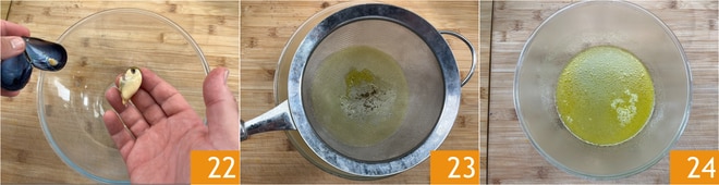 Descarte as conchas 22 e coloque os mexilhões em uma tigela. Coe o líquido de cozimento dos mexilhões 23 e reserve 24.