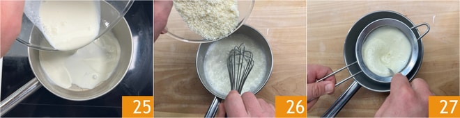 Por último, prepare o creme de pecorino: despeje o creme de leite em uma panela pequena 25 e leve quase à fervura, em seguida, retire a panela do fogo e adicione o pecorino romano ralado 26. Misture vigorosamente com um batedor até que esteja completamente derretido. Passe o creme por uma peneira para torná-lo mais liso e homogêneo 27.