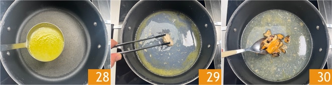 Agora, despeje em uma frigideira grande uma concha do líquido de cozimento dos mexilhões 28, em seguida, adicione uma colher de pasta de bacon 29. Deixe o bacon derreter em fogo baixo, depois adicione os mexilhões 30 e cozinhe por alguns minutos.