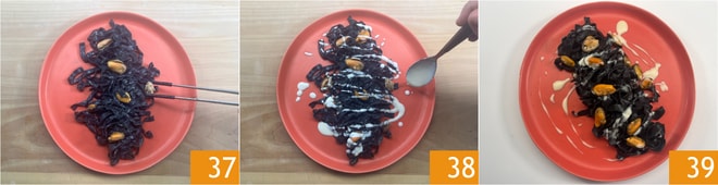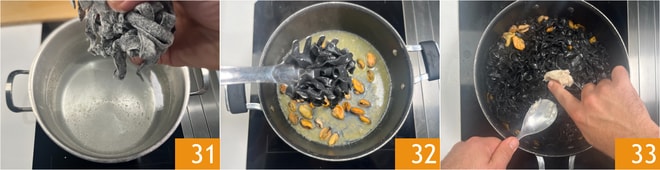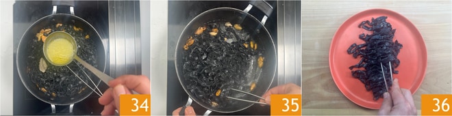 Se necessário, você pode ajustar a cremosidade adicionando um pouco mais da água de cozimento dos mexilhões 34, depois misture bem 35. Emprate as tagliatelle ao negro de sépia 36.