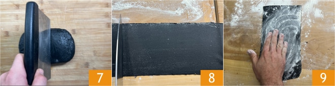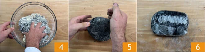 Incorpore a mistura ao negro de sépia, trabalhando primeiro com um garfo e depois com as mãos 4 até obter uma massa lisa e homogênea 5. Envolva em filme plástico 6 e deixe descansar por 30 minutos à temperatura ambiente.