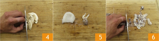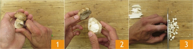 Para preparar as tagliatelle com lulas e cogumelos, comece limpando os porcini, raspando com a ajuda de uma faquinha o caule dos cogumelos 1, e passe o chapéu com um pedaço de papel úmido para remover o excesso de terra. É importante que os porcini toquem o mínimo de água possível. Neste ponto, separe os chapéus dos caules 2. Corte os caules em pequenos cubos 3.