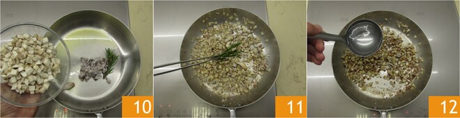 Adicione também os cubos de cogumelos porcini 10. Refogue bem em fogo alto por cerca de 5 minutos. Retire o alho e o alecrim 11, adicione uma generosa concha de água 12, ajuste o sal.