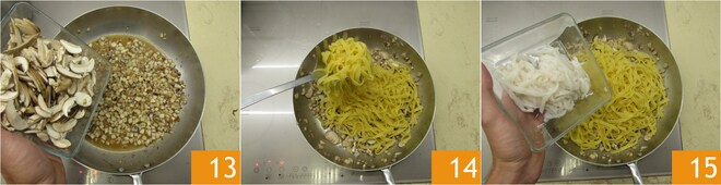 Adicione o resto dos cogumelos 13. Enquanto isso, cozinhe a massa, que você irá escorrer bem al dente diretamente na frigideira 14. Termine o cozimento da massa adicionando o restante das lulas 15.