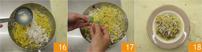 Adicione também a água de cozimento, quanto baste 16. Finalize com um fio de azeite e o tomilho desfolhado 17. As tagliatelle com lulas e cogumelos estão prontas 18.
