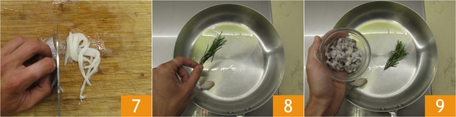 Corte o restante ao longo do comprimento em tiras 7. Retire algumas folhas de tomilho que você usará na finalização do prato. Aqueça bem um fio de azeite na frigideira, adicione o ramo de alecrim e o dente de alho 8, coloque os tentáculos das lulas picados 9.