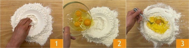 Para preparar os tagliolini ao caviar, comece pela massa fresca: despeje a farinha na bancada, forme uma cavidade no centro 1 e adicione os ovos aos poucos 2, misturando-os com um garfo 3.