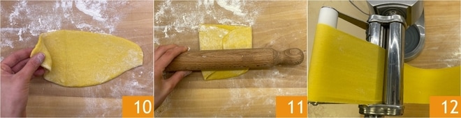 Dobre as bordas externas da massa em direção ao centro 10, depois achate novamente com o rolo de massa 11 e passe várias vezes entre os rolos da máquina de massa, diminuindo gradualmente a espessura, até chegar na penúltima 12.