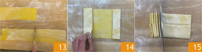 Corte 3 retângulos das massas obtidas 13 e polvilhe com farinha, depois enrole os lados curtos sobre si mesmos até chegar ao centro 14. Corte a massa assim enrolada em tiras de 2-3 mm de largura 15.