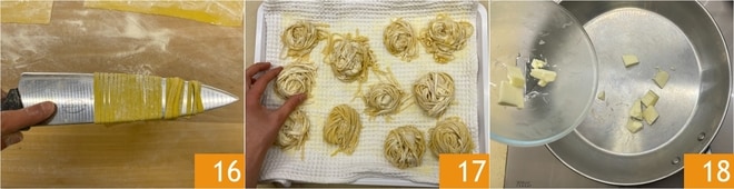 Levante os tagliolini com a lâmina da faca 16, forme ninhos e coloque-os em uma bandeja polvilhada com sêmola 17. Neste ponto, coloque no fogo uma panela de água para ferver com sal para cozinhar os tagliolini. Enquanto isso, derreta a manteiga em uma frigideira grande 18.