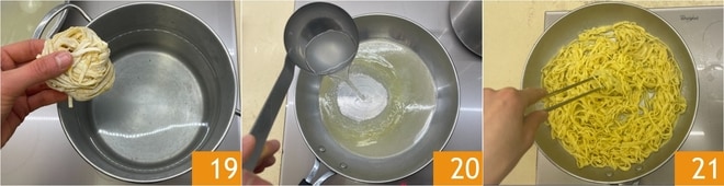 Coloque os ninhos de tagliolini e cozinhe por 1-2 minutos 19, enquanto isso despeje uma concha da água de cozimento na frigideira com a manteiga derretida 20 e misture para criar uma emulsão. Escorra os tagliolini diretamente na frigideira e salteie-os com o molho 21.