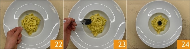 Decore cada prato com o funcho 22 e 5 g de caviar 23. Sirva imediatamente os seus tagliolini ao caviar 24!