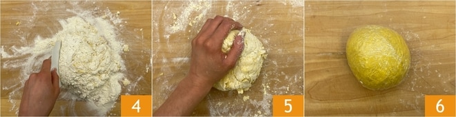 Use um raspador de massa para juntar toda a mistura 4 e continue a trabalhar com as mãos 5, até obter uma massa lisa e homogênea. Embrulhe a massa em filme plástico e deixe descansar em um local fresco por 30 minutos 6.